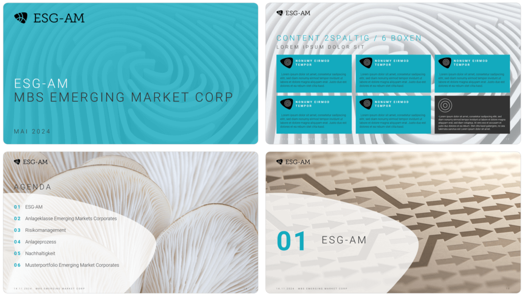 - Entwurf von themenspezifischen Bilderwelten, die Sie in der Präsentation individuell zur Unterstützung Ihres Contents einsetzen können. Wir arbeiten sowohl mit lizenzfreien als auch kostenpflichtigen Anbietern zusammen.