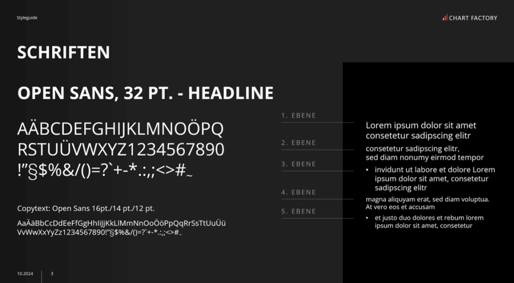 Definition einer Schriften­ordnung inklusive Schrift­arten / Größen / Absätzen / Aufzählungs­zeichen.