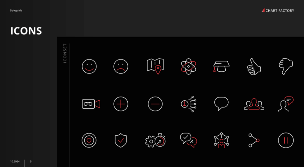 Zusammenstellung und Layout von themenspezifischen Icons zur bildlichen Unterstützung und Struk­turie­rung des Contents Ihrer Präsentationen.